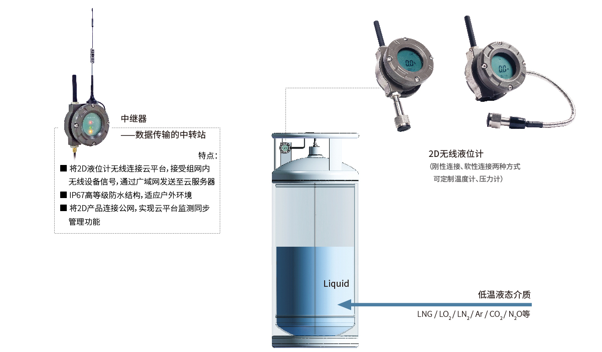 整套系統(tǒng)只通過一套數(shù)據(jù)中繼器及每個(gè)液氮罐杜瓦瓶上的無線液位計(jì)即可實(shí)現(xiàn)多終端的無線上網(wǎng),數(shù)據(jù)互聯(lián).